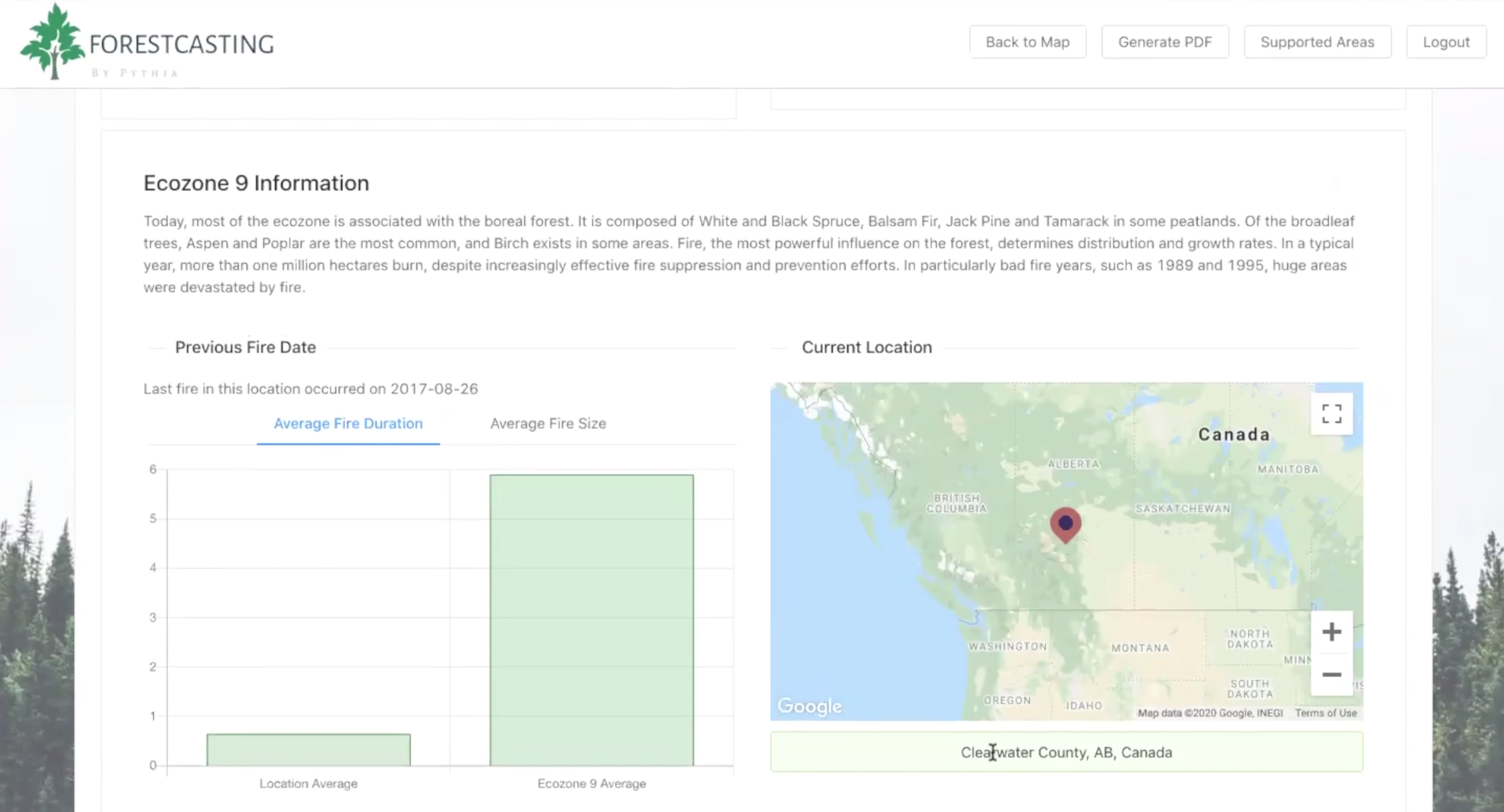 On top of risk and damage prediction, the report provides additional data on weather, ecoregion, previous fire occurrences, nearby population, protected areas, tree coverage, elevation and more!