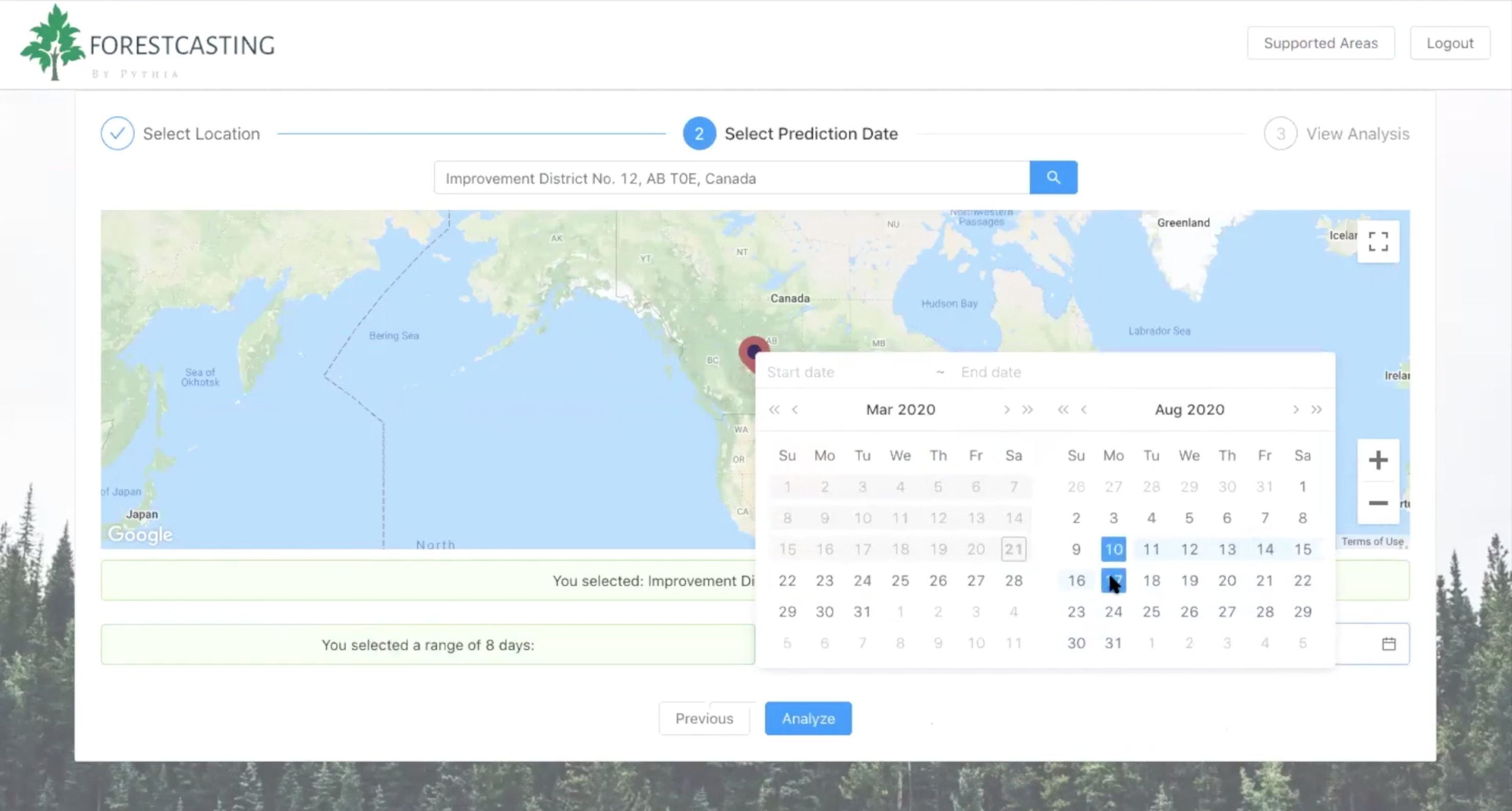 The Forestcasting tool consists of (1) a machine learning model that calculates the probability a forest fire could occur in a given area, and (2) a mathematical damage algorithm that estimates the severity of damages caused by said fire.